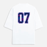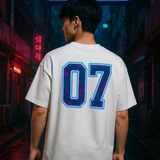 Drop into Seoul’s electrifying vibe with theΒ SEOUL 07 Oversized Street Edition Tee. ThisΒ bold, roomy t-shirtΒ features aΒ striking 'SEOUL' graphic on the front (10x10 inches)Β and a show-stoppingΒ β€œ07” varsity print on the back (13x13 inches) – rendered in deep electric blues, pink streaks, and glowing outlines that scream neon nightlife.